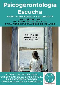 - Se generó desde las asociadas la propuesta solidaria, comunitaria y gratuita “Psicogerontología escucha” con el objetivo de acompañar responsable y empáticamente a las personas mayores de 65 años en el período de aislamiento social. El dispositivo se implementó a través de la atención y escucha telefónica desde una perspectiva de derechos. Estuvo a cargo de Licenciadas en Psicología especializadas en Psicogerontología con el fin de reforzar las conductas de autocuidado, reconocer las posibles redes de las personas mayores, estimular la adherencia a las medidas sanitarias minimizando su exposición en el rango de lo posible; apelando a la responsabilidad social y dando alternativas adecuadas a cada situación particular.
